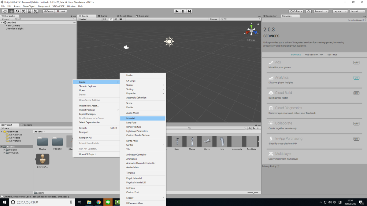 [Assets]ウィンドウ内を右クリック-[Create]-[Material]