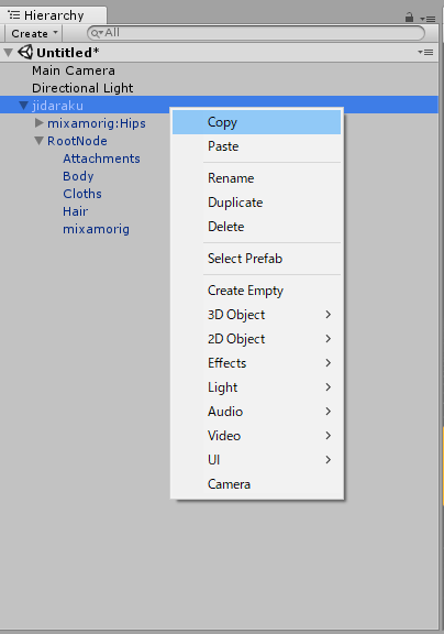 [Hierarchy]のモデルを右クリックして、[Copy]します。