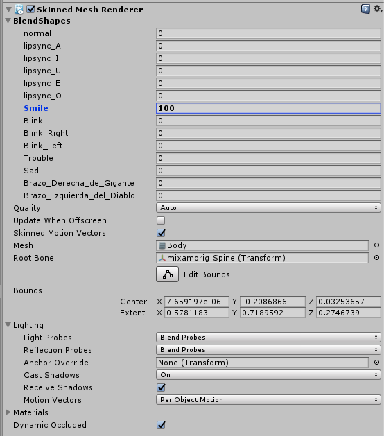 複製したモデルの中からモーフが含まれるオブジェクトを選択し、[Inspector]タブの[Skinned Mesh Renderer]-[BlendShapes]をクリックし展開します。